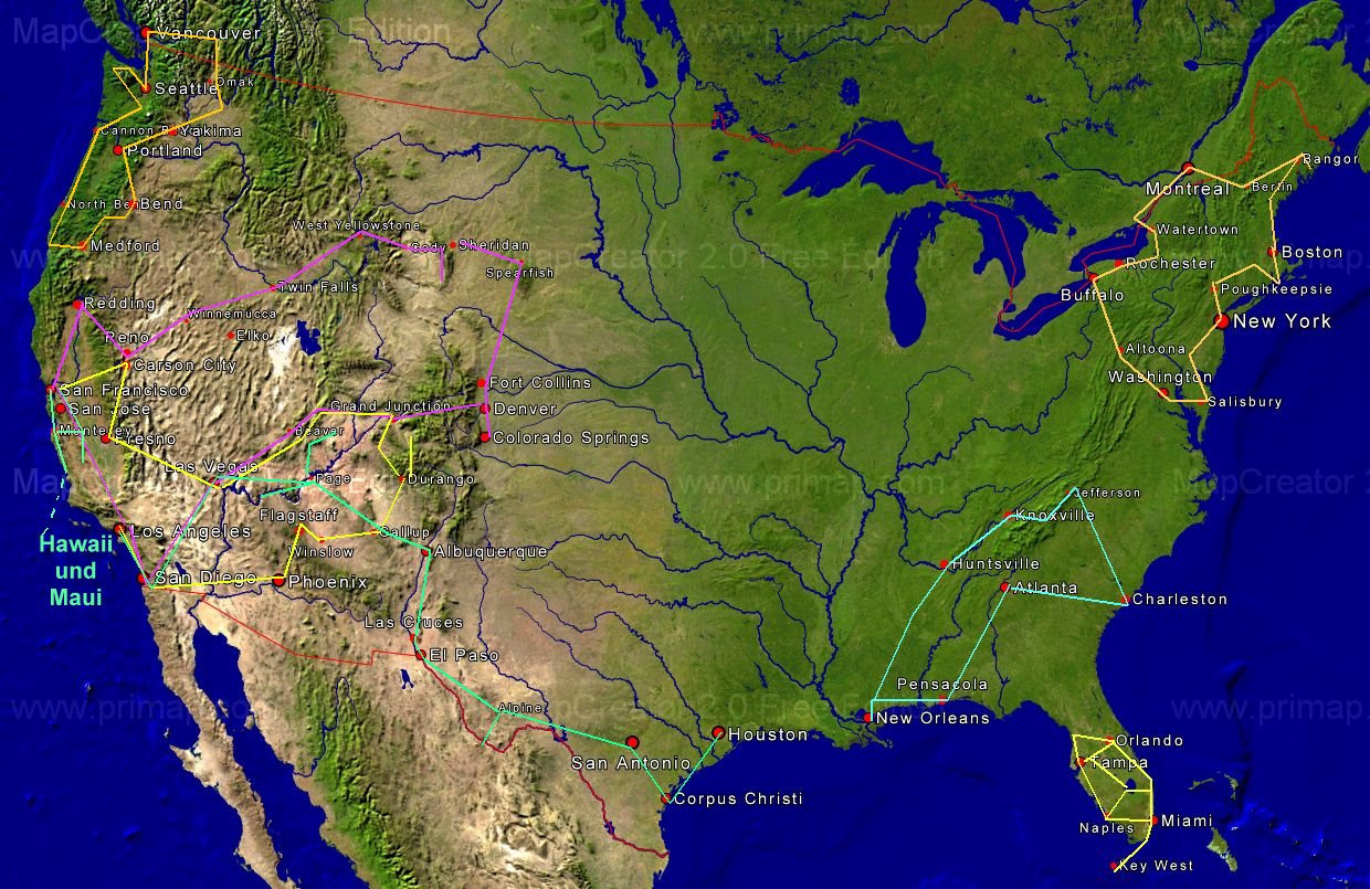 24 Jahr lang reisen wir mehr oder minder regelmäßig in die USA. Klar, uns hat der USA-Virus gepackt ;-). Es gibt ohnehin nur 2 Arten von US-Reisenden: Die, die einmal und nie wieder hinfahren, und die, die - vom “Virus” gepackt - immer wieder dorthin reisen. Hier eine Karte unserer bisherigen Rundreisen (alle selber zusammengestellt und durchgeführt mit Leihwagen und Motelübernachtungen): Gelb: 3 Wochen “Der südliche Westen”: Unsere erste Reise 1994 von LA über San Diego, Tijuana (Mexico), Phoenix, Grand Canyon, Rocky Mountains, Arches NP, Brice NP, Zion NP, Las Vegas, Death Valley, Sequoia NP, Yosemite NP, San Francisco.